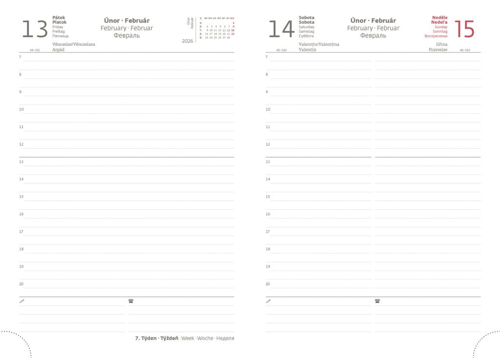 Diář obsahuje: osobní údaje, plánovač dovolené (měsíční přehled), plánovací kalendář, telefonní předvolby, státní svátky České a Slovenské republiky, mezinárodní svátky, roční výhled, denní layout, adresář, mapa Evropy a České a Slovenské republiky