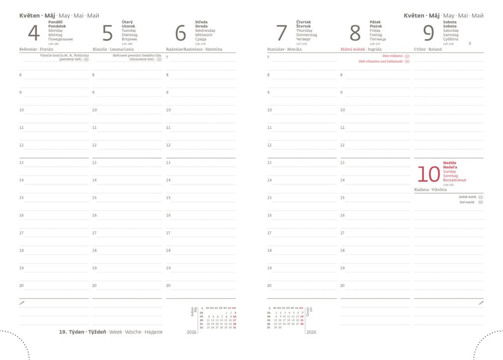 Formát diáře: 145 x 205 mm Rozsah diáře: 128 stran Kalendárium: týdenní